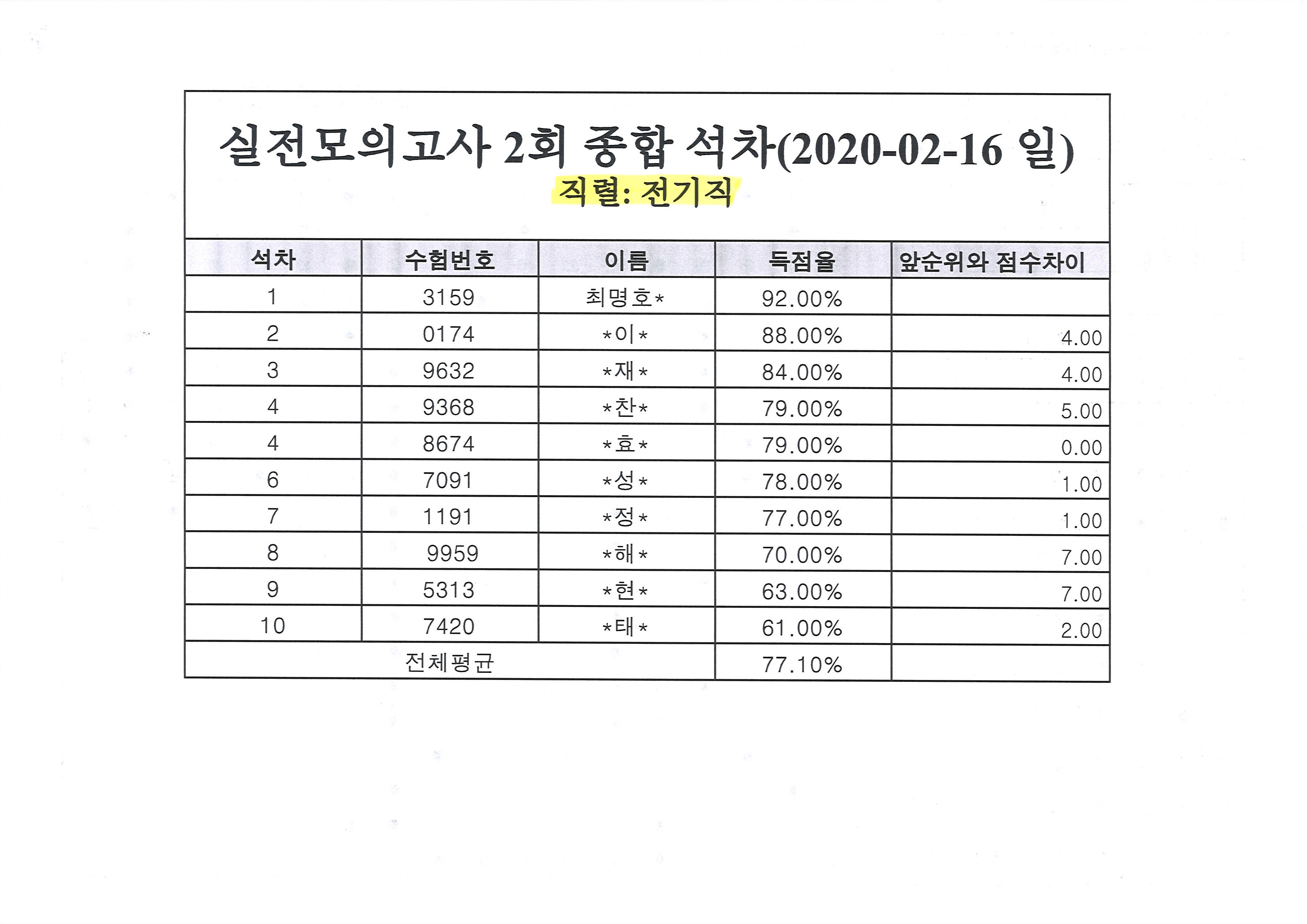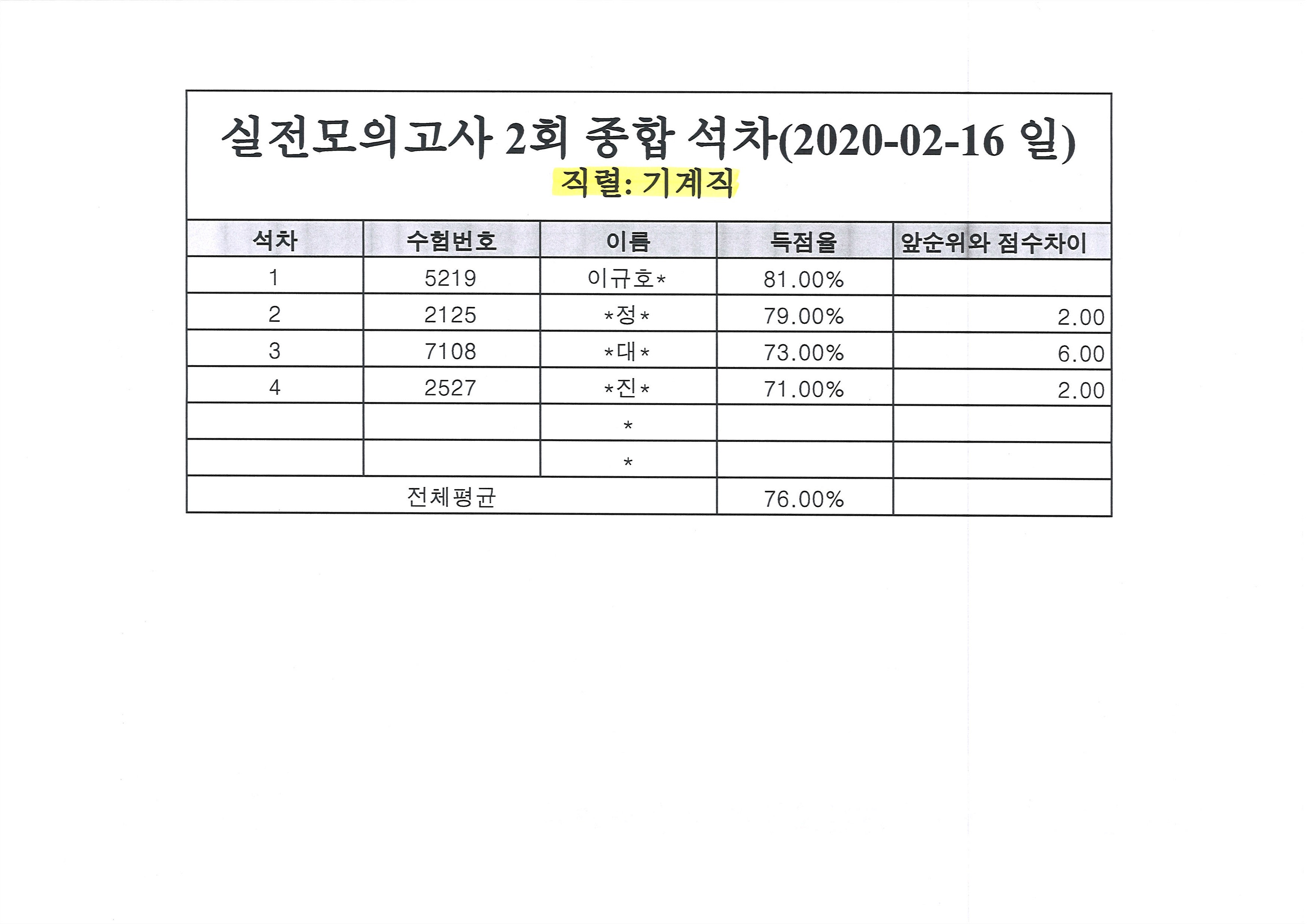 어제 2회차 실전현장모의고사 직렬별 점수 및 석차입니다.