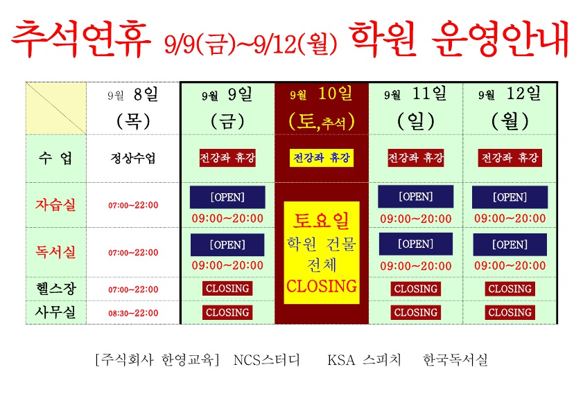 추석연휴 9/9(금)~9/12(월) 학원 운영안내