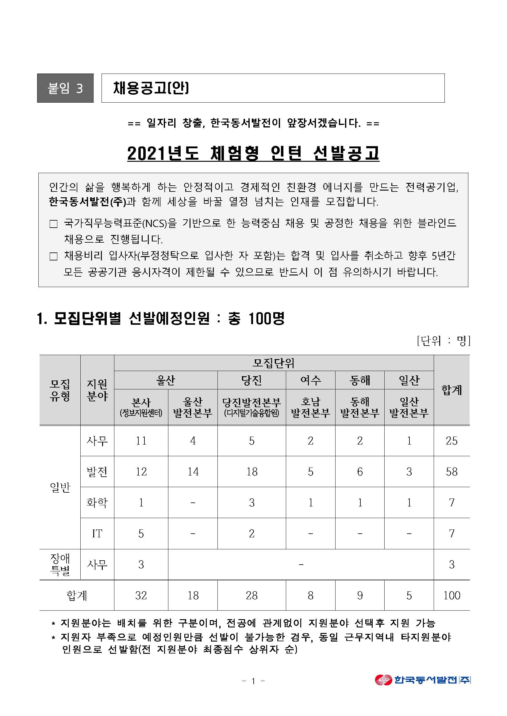 한국동서발전(주) 2021년도 체험형 인턴 선발