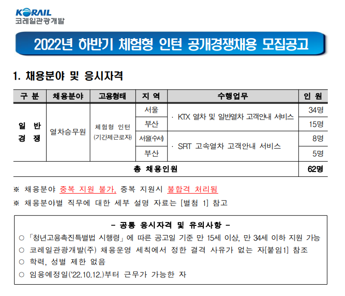2022 하반기 코레일관광개발(주) 체형형 인턴 채용 공고