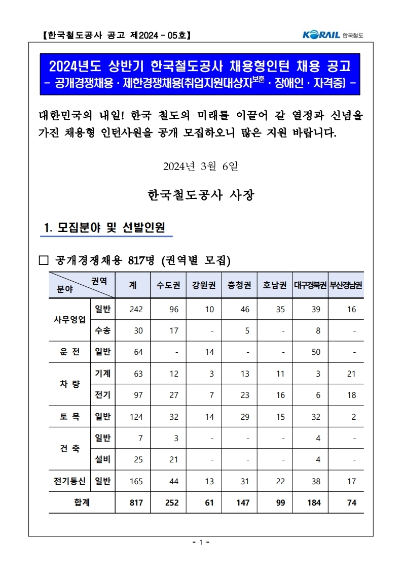2024년 상반기 한국철도공사 채용형인턴 채용 공고
