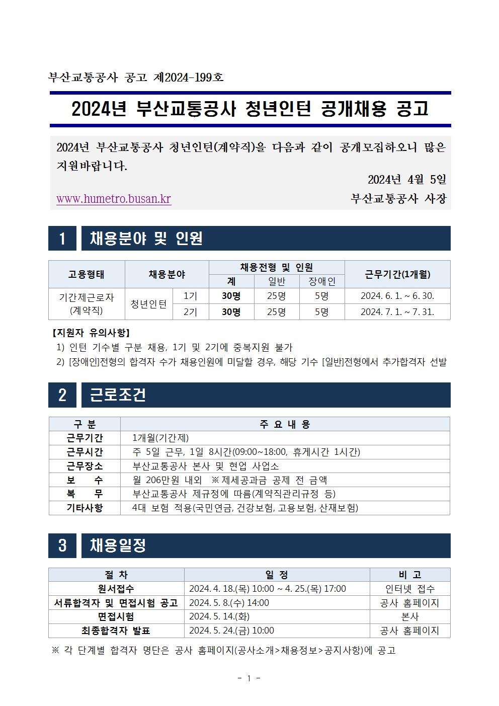 2024년 부산교통공사 청년인턴(계약직) 채용 공고