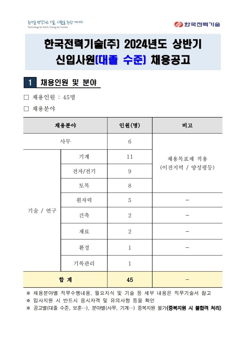 2024년 한국전력기술 상반기 신입사원(대졸 수준) 채용 공고