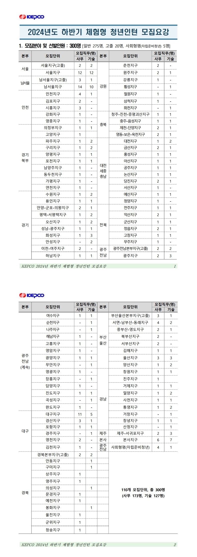 2024년 한국전력공사 하반기 체험형 청년인턴 모집 공고