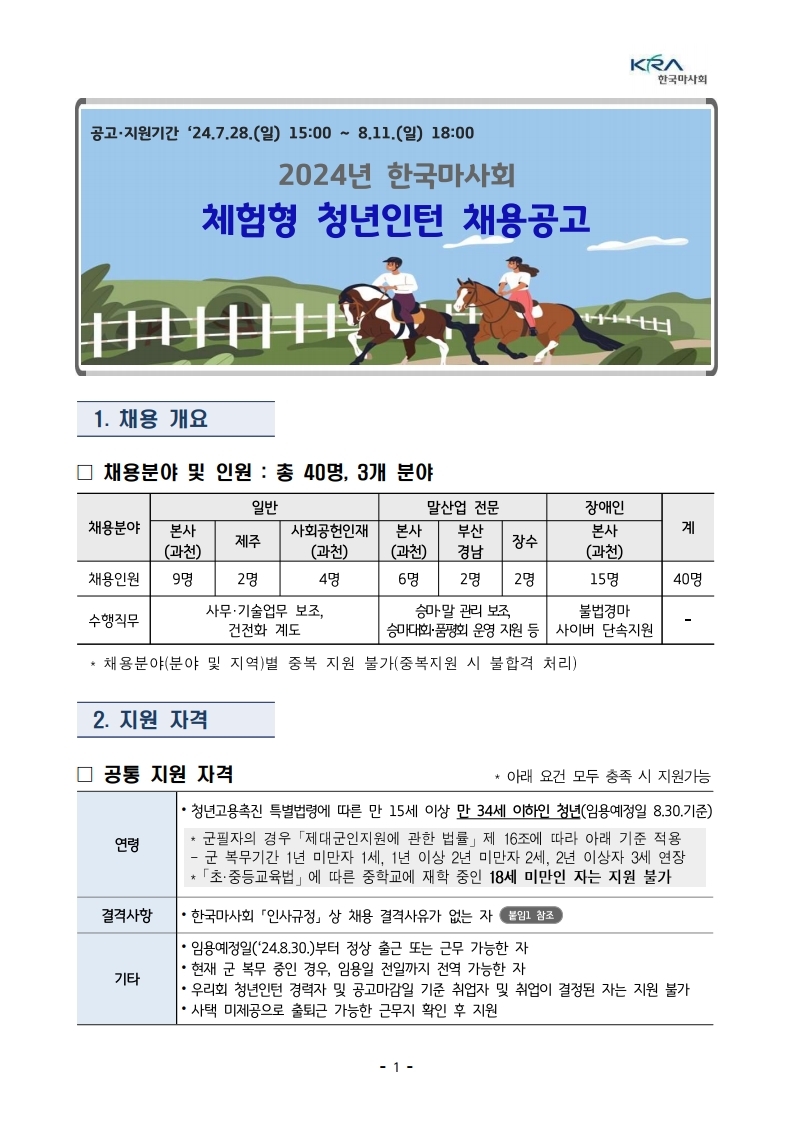 2024년 한국마사회 체험형 청년인턴 채용 공고