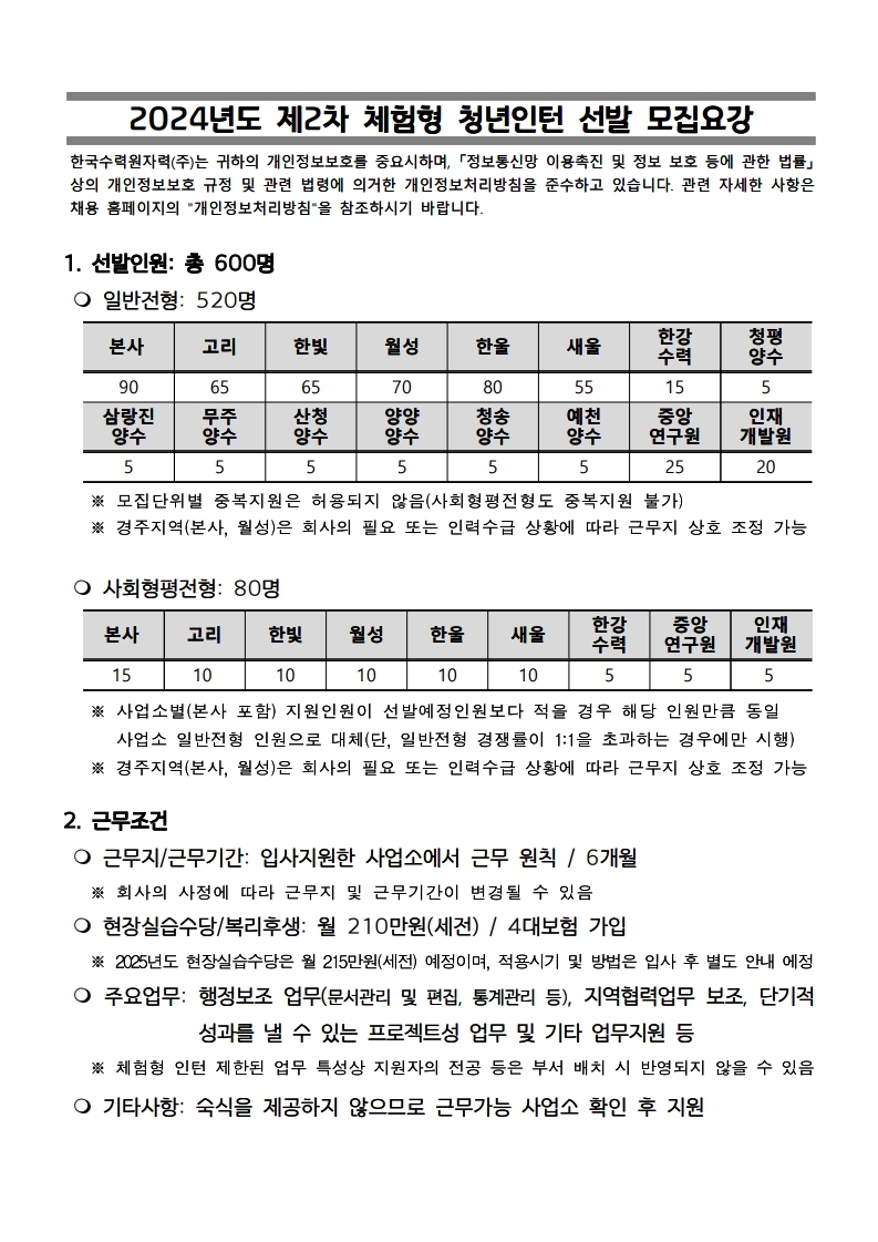 2024년 한국수력원자력 제2차 체험형 청년인턴 선발 모집 공고