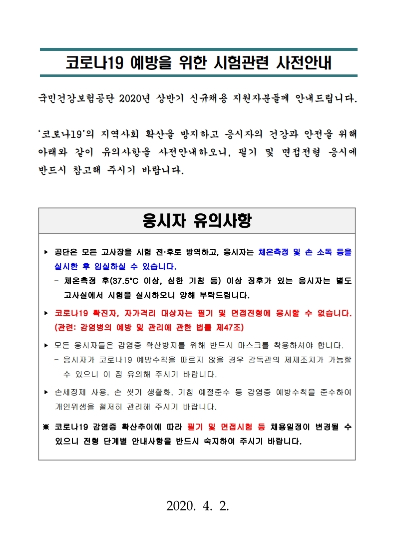 ○ 코로나바이러스감염증-19 확산 추이에 따라 지원자의 안전을 고려하여 채용일정이 변경될 수 있으니 전형별 사전안내를 반드시