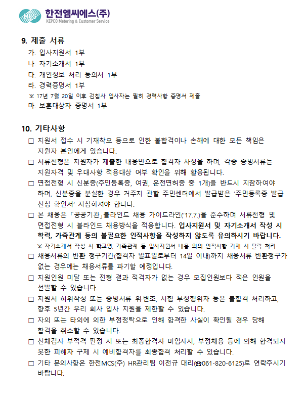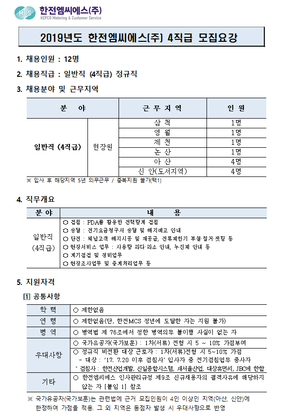 첨부파일 한전MCS(주) 입사지원서 및 자기소개서.hwp 2019년도 한전MCS(주) 4직급 모집공고.hwp