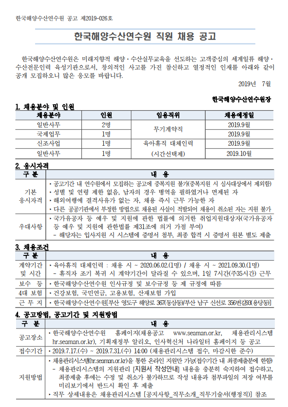 한국해양수산연수원 무기계약직/계약직 직원 채용 (~07/31)