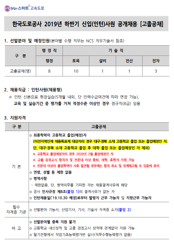 한국도로공사 채용형인턴(일반, 고졸) 채용 (~ 08/16)