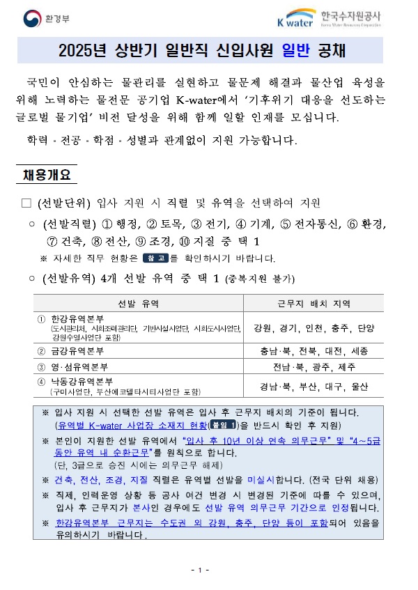 2025년 상반기 한국수자원공사 일반직 신입사원 일반 공채
