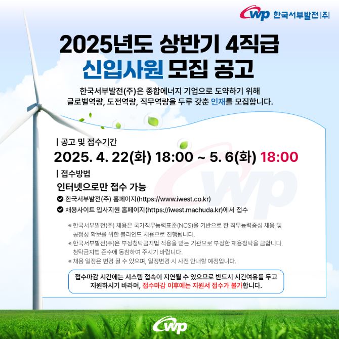 2025년 상반기 한국서부발전 4직급 신입사원 모집 공고