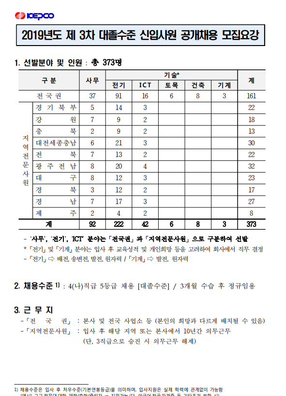 한국전력공사 2019년도 제 3차 대졸수준 신입직원 채용 (~10/14)