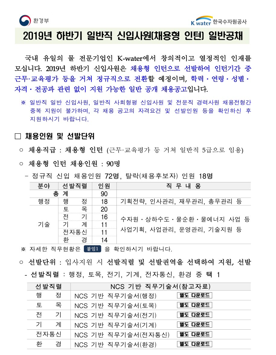 한국수자원공사 하반기 채용형 인턴 채용 (~07/16)